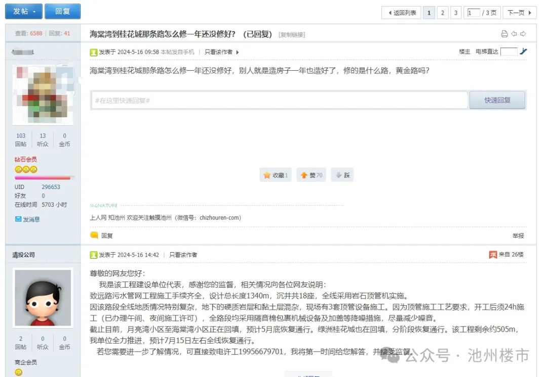 有网友在网上反映海棠湾到桂花城门前的致远路修路修了一年还没有修好,近日得到了池州清投公司的回复,具体原文如下: