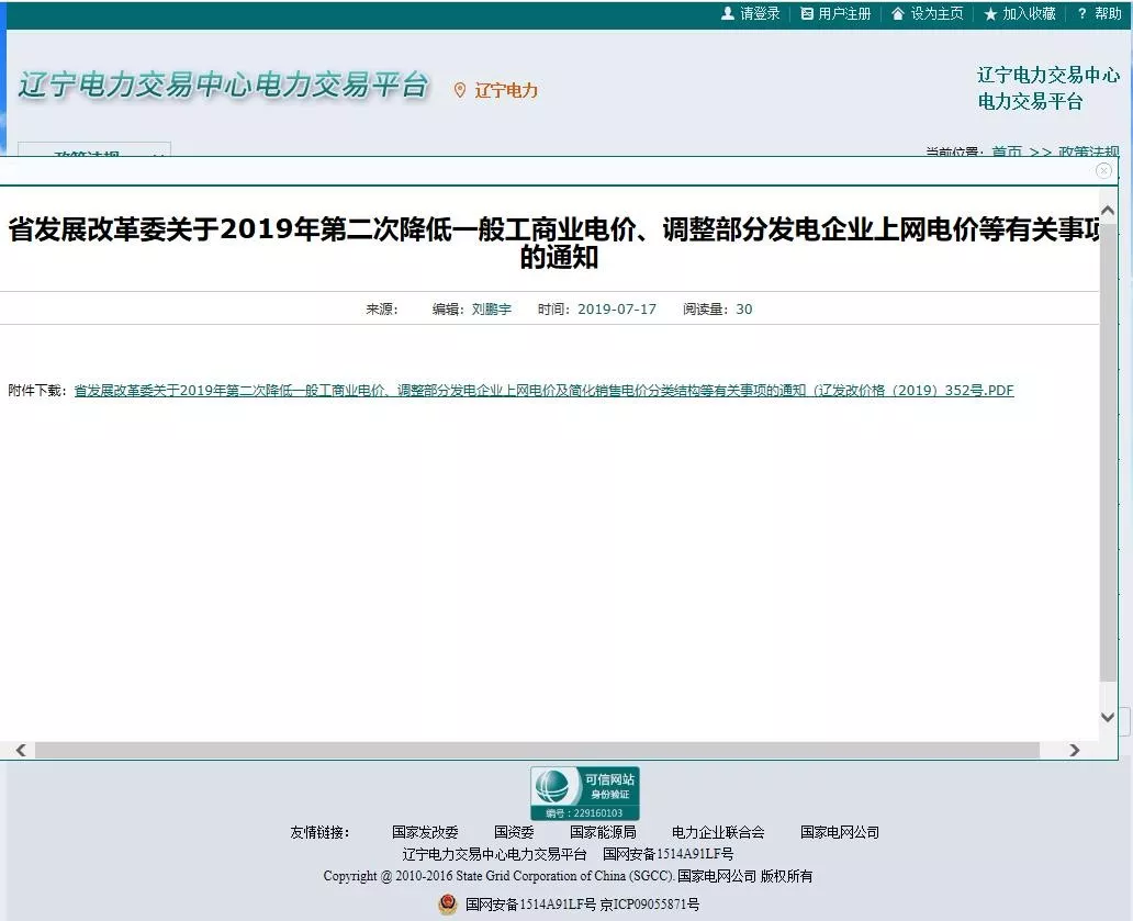 辽宁省发展改革委《关于2019年第二次降低一般工商业电价、调整部分发电企业上网电价及简化销售电价分类结构等有关事项的通知》
