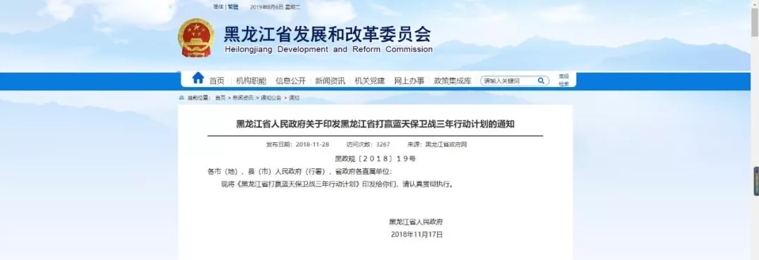 黑龙江省人民政府《关于印发黑龙江省打赢蓝天保卫战三年行动计划的通知》