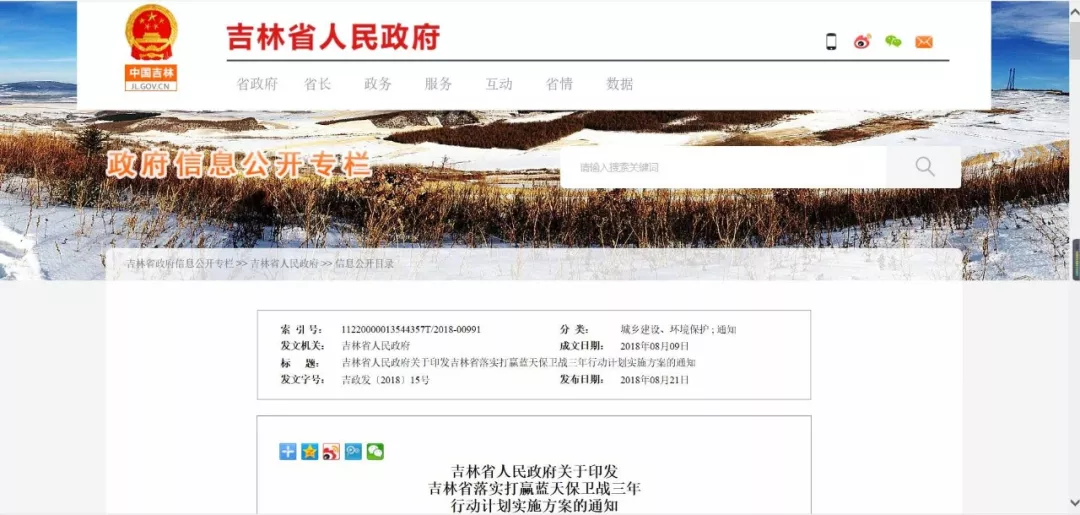 吉林省人民政府《关于印发吉林省落实打赢蓝天保卫战三年行动计划实施方案的通知》