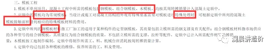 3、定额模板均为常规模板,当设计或施工对混凝土结构外观有特殊要求时,可按模板接触面积增列特殊模板材料费用。