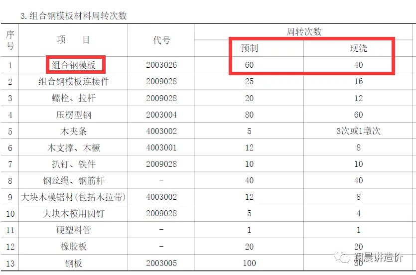 (1)定型钢模板上部结构分为预制和现浇。混凝土部位不在该表格中按组合钢模板周转次数确定。