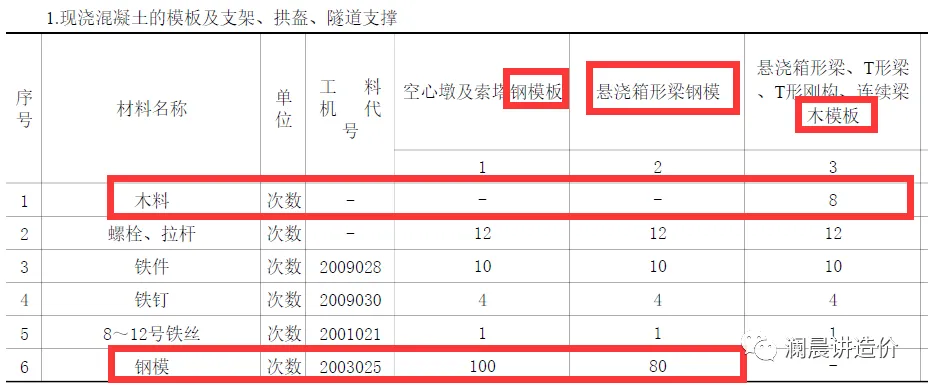 (3)从附录中查找该结构部位的定额模板摊销次数和主要消耗材料