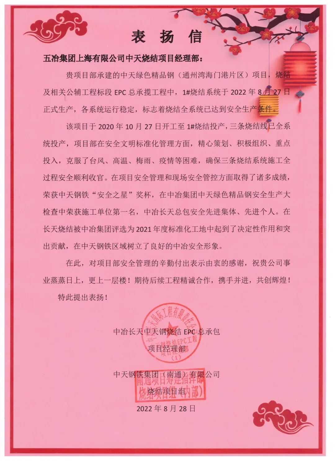 2022年8月27日上午9时,随着红矿在1#烧结机台车上缓缓驶出,中天绿色精品钢烧结项目的三条烧结系统均已达到安全投产条件,整个项目也进入了收尾阶段。历经22个月的艰苦奋战,项目团队对标国际最高标准、最好水平,尽最大努力将项目打造成让业主满意的优质工程,在项目安全管理和现场安全管控方面取得了诸多成绩,荣获中天钢铁“安全之星”奖杯,在中冶集团中天绿色精品钢安全生产大检查中荣获施工单位第一名,树立了良好的五冶安全形象。此外,三台烧结机同步建设在冶金工业建筑领域是一次重要的突破,充分展现了中国五冶集团冶金建设国家队的品牌实力。万丈钢厂平地起,五冶人以一流的管理能力、先进的施工技术,实现完美履约,助力中天绿色钢城在黄海之滨快速崛起。