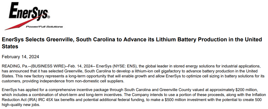 近日,美国电池上市公司EnerSys宣布,计划在美国南卡罗莱纳州建立一家新的锂离子电池超级工厂,该工厂是EnerSys在南卡罗来纳州的第二家工厂,设计年产能4GWh。