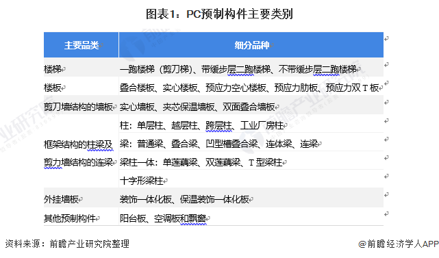 预制混凝土类构件大致可分为楼板、剪力墙结构的墙板、楼梯、框架结构的柱梁及剪力墙结构的连梁、外挂墙板和阳台板、飘窗等其他异型构件这六大类。