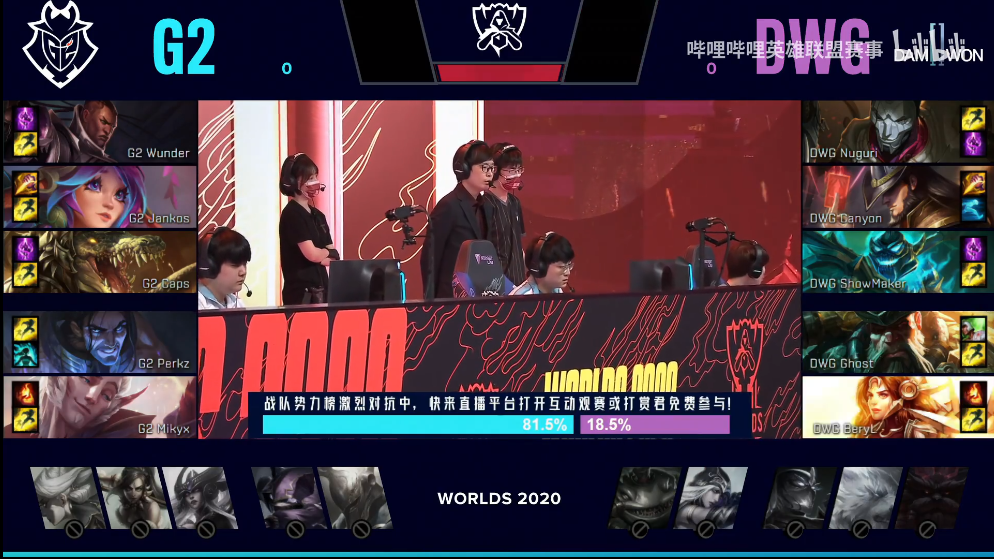 主要原因还是G2在蓝色方的BAN位不够,人家DWG红色方第一轮都有BAN狗熊的BAN位。蓝色方的G2,三个版本最OP的英雄,他一个也不能放。