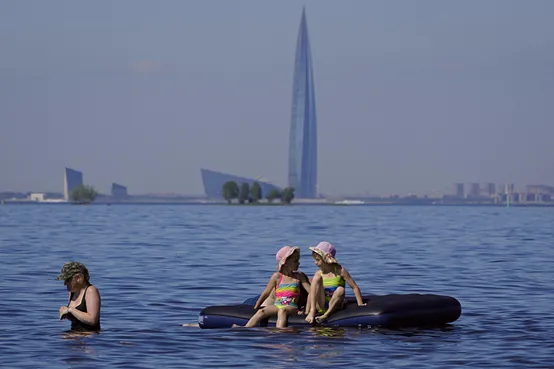 2022年6月25日,俄罗斯圣彼得堡民众在游泳,远处是俄罗斯天然气工业股份公司(Gazprom)总部。图|视觉中国