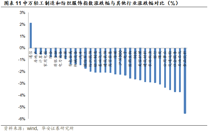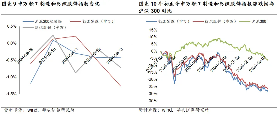 2024年9月9日至9月13日,上证综指下跌2.23%,深证成指下跌1.81%,创业板指下跌0.19%。分行业来看,申万轻工制造下跌2.07%,相较沪深300指数+0.16pct,在31个申万一级行业指数中排名14;申万纺织服饰下跌1.98%,相较沪深300指数+0.25pct,在31个申万一级行业指数中排名13。