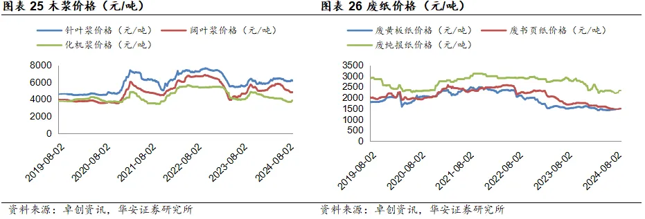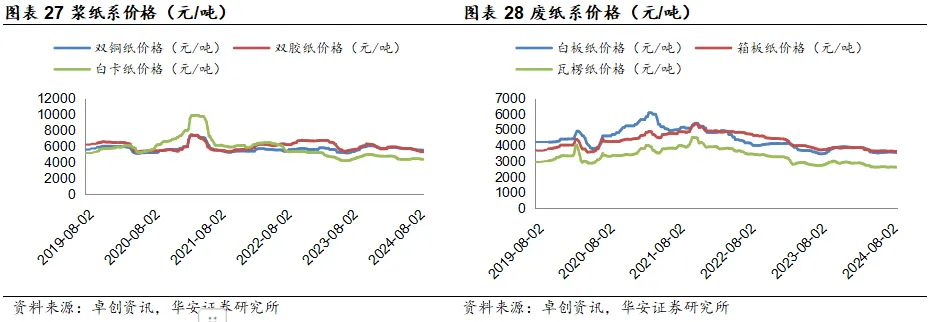 包装造纸数据追踪:1)纸浆&纸产品价格:截至2024年9月13日,针叶浆/阔叶浆/化机浆价格分别为6123.21/4790.91/3750元/吨,周环比-0.55%/-0.26%/-1.75%;废黄板纸/废书页纸/废纯报纸价格分别为1482/1498/2305元/吨,周环比-0.27%/0%/-0.86%;白卡纸/白板纸/箱板纸/瓦楞纸价格分别为4320/3480/3605.6/2596.88元/吨,周环比-0.69%/-1.45%/-0.15%/-0.41%;双铜纸/双胶纸价格分别为5510/5293.75元/吨,周环比0%/0%;生活用纸价格为6316.67元/吨,周环比0.53%。截至2024年7月15日,中纤价格指数:溶解浆内盘价格为7700元/吨。2)吨盈数据:截至2024年9月12日,双铜纸/双胶纸/箱板纸/白卡纸每吨毛利分别为-13.88/-283.49/489.92/-375.63元/吨。3)纸类库存:截至2024年8月31日,青岛港/常熟港木浆月度库存分别为1171/560千吨,环比8.43%/14.29%;双胶纸/铜版纸月度企业库存分别为528.46/390.5千吨,环比7.41%/2.14%;白卡纸月度社会库存/企业库存分别为1770/642.8千吨,环比2.31%/2.77%;生活用纸月度社会库存/企业库存分别为1220/555千吨,环比0.08%/-5.45%;废黄板纸月度库存天数为6.2天,环比-4.62%;白板纸月度企业库存/社会库存分别为728.2/1129千吨,环比3.84%/1.53%;箱板纸月度企业库存/社会库存分别为1575/1735千吨,环比1.48%/2.18%;瓦楞纸月度企业库存/社会库存分别为898/993千吨,环比-0.33%/1.95%。