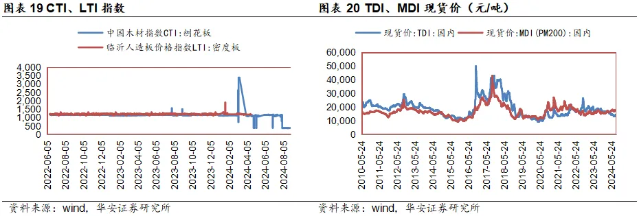 原材料数据:截至2024年8月30日,定制家居上游CTI指数为378.55,周环比-2.12%。截至2024年9月6日,软体家居上游TDI现货价为13700元/吨,周环比1.11%;MDI现货价为17950元/吨,周环比3.16%。