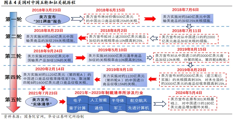 特朗普的关税政策引发中美贸易摩擦。2018年6月16日,美国贸易代表办公室公布了对华征税清单,标志着特朗普政府对中国关税加征政策的正式实施。2023年、2024年初,美国贸易代表办公室、301条款委员会及相关专家就法定审查举行了多次会议,讨论中国政府相关政策及“301关税”对美国经济的影响,并着重探讨了修改相关举措(比如进一步加征关税)的可能性和方向。于2024年5月14日,美国白宫发布公告,美国总统拜登指示美国贸易代表办公室(USTR)公布对华加征301关税四年期复审结果,宣布在原有对华301关税基础上,对中国进口的180亿美元产品加征额外关税。综合以上五轮关税加征清单来看,关税清单涉及的产品范围逐步扩大,不仅包含了生产制造和生活日用相关,更在原有对华301关税基础上,进一步提高进口的电动汽车、锂电池、光伏电池、关键矿产、半导体以及钢铝、港口起重机、个人防护装备等产品加征关税。其中包括被称为我国出口“新三样“的电动汽车、锂电池、光伏电池等新能源产品。