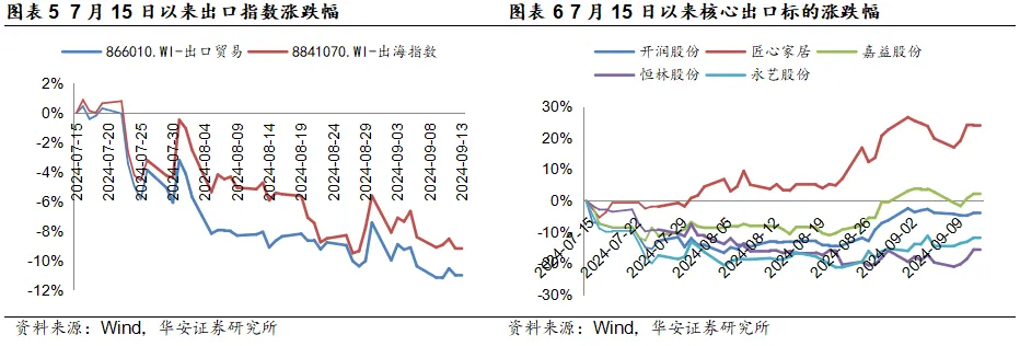 出口板块受枪击事件影响进行阶段性调整。美国东部时间7月13日下午,特朗普在宾夕法尼亚州内进行2024年总统候选人竞选集会的演讲过程中,遭遇枪袭事件,现场造成一人死亡,一人重伤,特朗普并未受到致命伤,袭击者当场被特勤局击毙。枪击事件后,由于特朗普的关税政策主张,A股出口板块受到市场情绪影响,进行阶段性调整。7月15日至9月13日,866010.WI-出口贸易/8841070.WI-出海指数分别下跌11.01%/9.20%,核心出口标的开润股份/匠心家居/嘉益股份/恒林股份/永艺股份的涨跌幅分别为-4%/24%/2%/-16%/-12%。