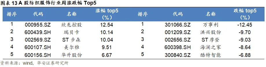 纺织服饰行业一周涨幅前十分别为欣龙控股(+12.54%)、瑞贝卡(+10.14%)、ST步森(+10.04%)、美尔雅(+9.51%)、华升股份(+6.67%)、嘉麟杰(+4.91%)、华茂股份(+4.89%)、航民股份(+3.45%)、*ST天创(+3.4%)、日播时尚(+3.03%),跌幅前十分别为万事利(-12.45%)、洪兴股份(-9.7%)、ST摩登(-9.03%)、海澜之家(-8.64%)、酷特智能(-6.88%)、罗莱生活(-6.85%)、太平鸟(-6.23%)、深中华A(-5.88%)、台华新材(-5.71%)、比音勒芬(-5.5%)。