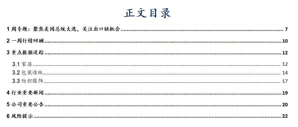 哈里斯与特朗普主张的贸易政策不同。北京时间 2024 年 9 月11 日早间,哈里斯与特朗普在美国广播公司举行的总统辩论中展开首次对决,在贸易政策上两位候选人都带有保护主义色彩,但他们对待中国的方式有所不同。哈里斯主张对包括中国科技产品在内的行业和地缘政治对手采取有针对性的关税,而特朗普则提议对所有中国商品征收60%的关税。哈里斯优势扩大,但选情仍将较为焦灼。根据PredictIt数据,截至9月13日,哈里斯支持率上涨至 57%,特朗普则下跌至 46%。民调方面,9月10日至11日的路透社/益普索民调结果显示,哈里斯在登记选民中的支持率领先特朗普5个百分点。8月21日至28日的路透社/益普索民调显示,哈里斯领先特朗普4个百分点。双方的差距均较低,大选的悬念或需等到最后一刻才能揭晓。特朗普的关税政策引发中美贸易摩擦。2018年6月16日,美国贸易代表办公室公布了对华征税清单,标志着特朗普政府对中国关税加征政策的正式实施。2023年、2024年初,美国贸易代表办公室、301条款委员会及相关专家就法定审查举行了多次会议,讨论中国政府相关政策及“301关税”对美国经济的影响,并着重探讨了修改相关举措(比如进一步加征关税)的可能性和方向。出口板块受枪击事件影响进行阶段性调整。美国东部时间7月13日下午,特朗普在宾夕法尼亚州内进行2024年总统候选人竞选集会的演讲过程中,遭遇枪袭事件,现场造成一人死亡,一人重伤,特朗普并未受到致命伤,袭击者当场被特勤局击毙。枪击事件后,由于特朗普的关税政策主张,A股出口板块受到市场情绪影响,进行阶段性调整。中国企业积极推动产能出海,并开拓多元市场。在对美出口关税压力与企业全球战略转型的共同推动下,轻工企业面向全球布局以应对贸易战,拓展海外市场已从“可选项”演变为“必选项”。由各家居上市公司年报业绩总结来看,有产能外迁计划的麒盛科技、恒林股份、乐歌股份等公司业绩营收增速,相比无产能外迁计划的企业营收增速表现更好。虽然短期海外选情变数导致市场担心出口链受关税影响,近期调整幅度较大,但我们认为,在中美贸易摩擦的环境下,头部企业积极推动海外产能布局应对关税风险,他们的海外扩产优势将会越发明显,而中小企业或不具备海外建厂能力或海外扩产太晚,抗关税风险能力较弱,出口行业集中度或因此迎来加速提升。建议关注业绩高增+低估值+第二成长曲线+海外成熟产能布局的标的,随着出口链情绪改善,有望迎来估值修复。