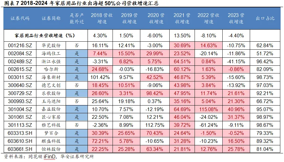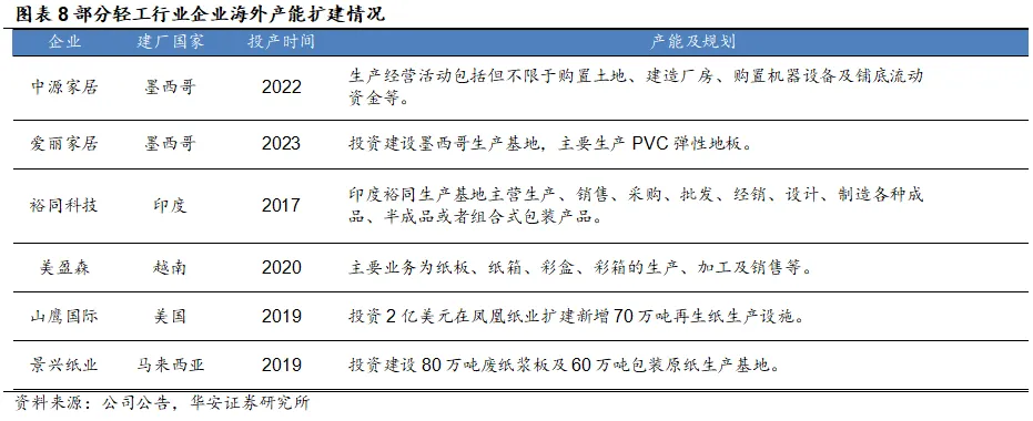 中国企业积极推动产能出海,并开拓多元市场。在对美出口关税压力与企业全球战略转型的共同推动下,轻工企业面向全球布局以应对贸易战,拓展海外市场已从“可选项”演变为“必选项”。企业产能出海的增长逻辑主要在于降低成本后的规模扩张,在发展中国家建立生产基地,就意味着获得低廉的人力资源成本、规避贸易关税壁垒、节省运输成本、扩大自身产能规模等优势。由各家居上市公司年报业绩总结来看,有产能外迁计划的麒盛科技、恒林股份、乐歌股份等公司业绩营收增速,相比无产能外迁计划的企业营收增速表现更好。