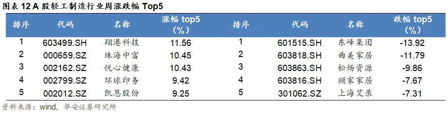 轻工制造行业一周涨幅前十分别为翔港科技(+11.56%)、珠海中富(+10.45%)、悦心健康(+10.43%)、环球印务(+9.42%)、凯恩股份(+9.25%)、亚振家居(+7.28%)、群兴玩具(+6.21%)、康欣新材(+4.35%)、天振股份(+3.41%)、四通股份(+3.12%),跌幅前十分别为东峰集团(-13.92%)、曲美家居(-11.79%)、松炀资源(-9.86%)、顾家家居(-7.67%)、上海艾录(-7.31%)、索菲亚(-6.91%)、海伦钢琴(-6.65%)、博汇纸业(-6.58%)、永吉股份(-6.1%)、梦百合(-5.94%)。