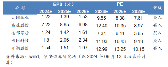 投资建议 1)家居:家居板块当前估值折价,且头部公司估值向家电历史低位靠近,我们判断探底接近尾声。建议关注经营稳健的板块头部公司和成长性较高的智能家居赛道。2)造纸:7月为下游原纸行业淡季,导致浆价下行,内外盘差价扩大,但随着8月进入需求旺季,原纸行业开工回升或支撑浆价走势由跌回升,文化纸企集中度较高,在浆价涨价时,提价函更能够顺畅落地,盈利能力将进一步修复,建议关注横向产品多元化、纵向林浆纸一体化的太阳纸业。3)包装:若此次中粮包装成功被收购,二片罐行业 CR3 将从 57%提升至 73%,行业集中度提升下,头部企业议价能力有望提升,从而带动行业整体盈利提升。建议关注包装头部企业。4)出口:虽然短期海外选情变数导致市场担心出口链受关税影响,近期调整幅度较大,但我们认为,在中美贸易摩擦的环境下,头部企业积极推动海外产能布局应对关税风险,他们的海外扩产优势将会越发明显,而中小企业或不具备海外建厂能力或海外扩产太晚,抗关税风险能力较弱,出口行业集中度或因此迎来加速提升。建议关注业绩高增+低估值+第二成长曲线+海外成熟产能布局的标的。推荐公司盈利预测与评级