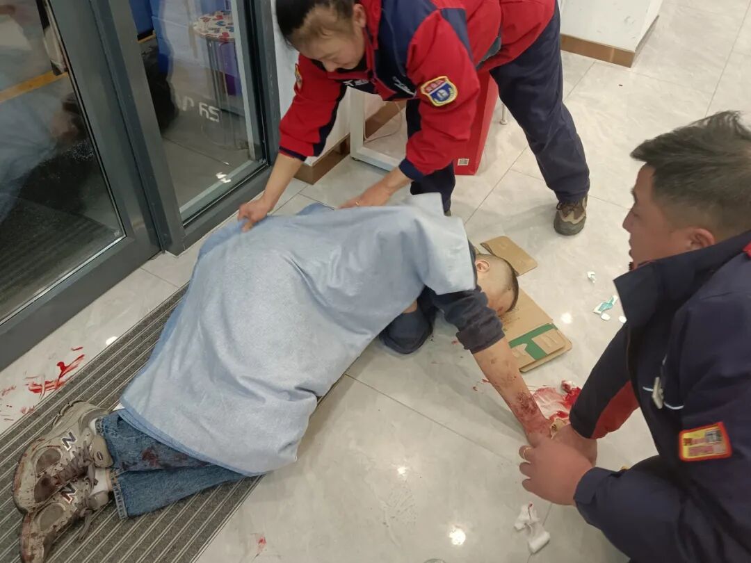 “快救救我……”12月14日凌晨1时许,一名30岁左右的男子摇摇晃晃跑进山东青岛石油第548加能站便利店,正在清理卫生的值班员工孙晓晓和姜辉听到声音立即上前询问情况。“我被玻璃割伤了……”该男子含糊不清地话没说完便晕倒在地。见其满身血迹,右手血流不止,孙晓晓和姜辉立即拨打120急救电话并将纸箱垫在该男子身下,同时拿出被子帮助其保暖。