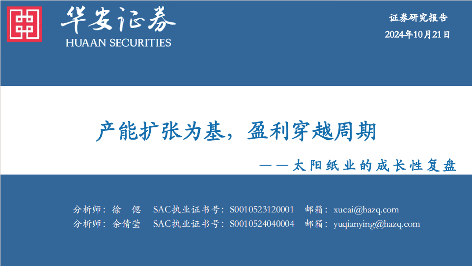 报告作者本文内容节选自华安证劵研究所已发布报告:《产能扩张为基,盈利穿越周期—太阳纸业的成长性复盘》(发布时间:20241022),具体分析内容详见报告若因对报告的摘编等发生歧义,应以报告发布当日的完整内容为准。