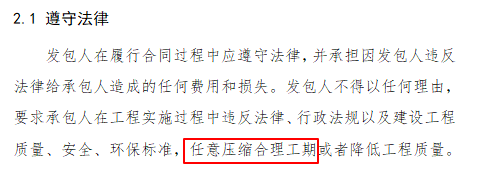 第二部分 第2条 发包人012.1 遵守法律:增加不得“任意压缩合理工期”。