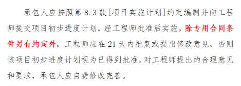 第二部分 第8条 工期和进度018.4.1 项目进度计划的提交和修改:增加“除专用合同条件另有约定外”。