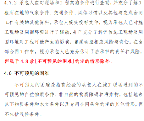 第二部分 第17条不可抗力0117.4 不可抗力后果的承担:红字为增加部分。划清不可抗力的风险点,保护承包人的合法权益。