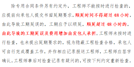 026.4.3 隐蔽工程检查:增加“顺延时间不得超过48小时”、“由此导致的工期延误及费用增加由发包人承担”。