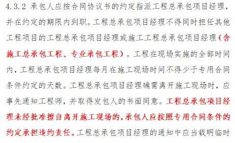 024.3 工程总承包项目经理:红字为增加部分。规定了工程总承包项目经理未经批准离开施工现场将承担违约责任,且不得兼职(含工程总承包、施工总承包)。
