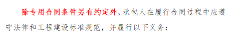 第二部分 第4条 承包人014.1 承包人的一般义务 :增加“除专用合同条件另有约定外”。