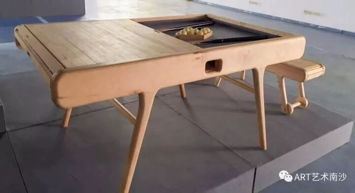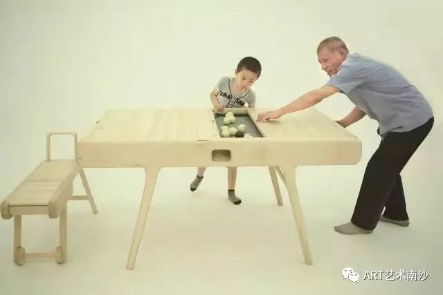 桌子两边设有可滚动的木板,合上是普通的桌子,打开是一张台球桌。