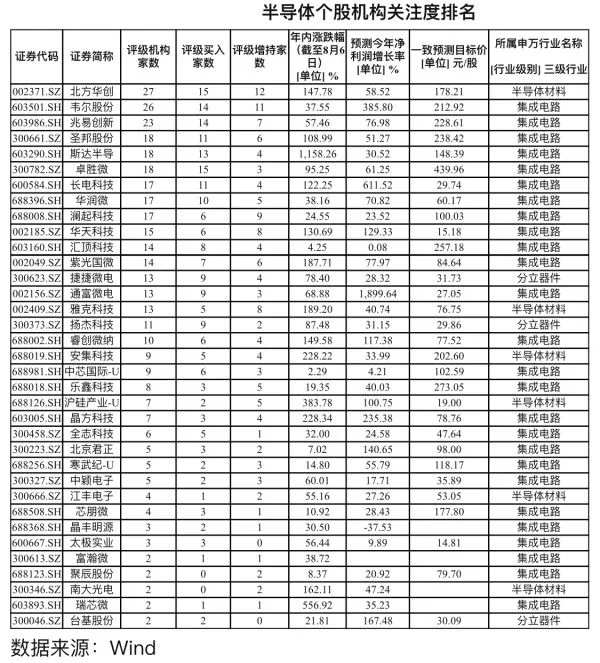 Wind数据显示,A股电子板块(申万一级行业)内半导体企业共有59家从机构关注度方面看,共有44只个股有机构评级其中北方华创(002371.SZ)有27家机构评级,位居榜首另外,韦尔股份(603501.SH)、兆易创新(603986.SH)、圣邦股份(300661.SZ)等17只个股均有10家以上机构评级。