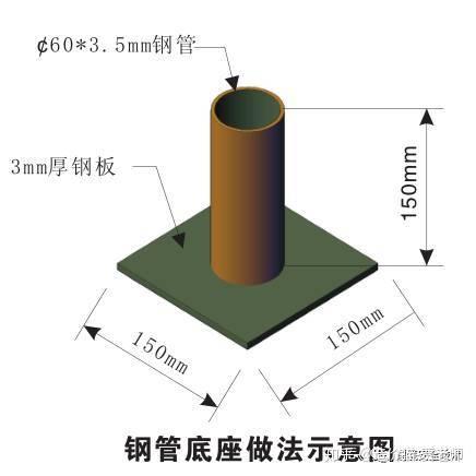 2、底座宜采用规格不小于150mm×150mm×6mm钢板和钢管套 管焊接组成,底座下应设置长度不少于2跨、宽度不小于150mm、厚度不小于50mm的木垫板或钢。