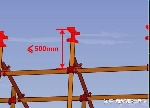 2、采用扣件钢管作支架时,螺杆伸出钢管长度不应大于200mm,可调托座伸出顶层水平杆的悬臂长度不应大于500mm;