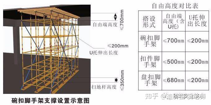 3、采用碗扣式、盘扣式或盘销式钢管作支架时,入立杆可调托座伸出顶层水平杆的悬臂长度不应大于650mm;