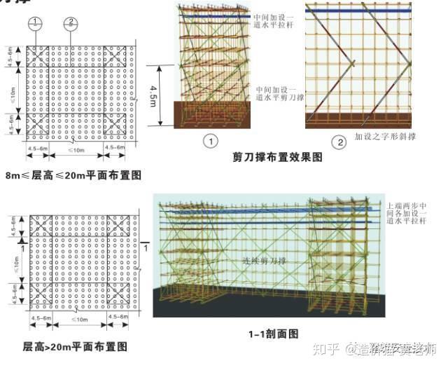 当建筑层高超过20m时,在满足以上规定的基础上,应将所有之字斜撑全部改为连续式剪刀撑(见图)。