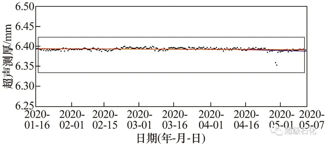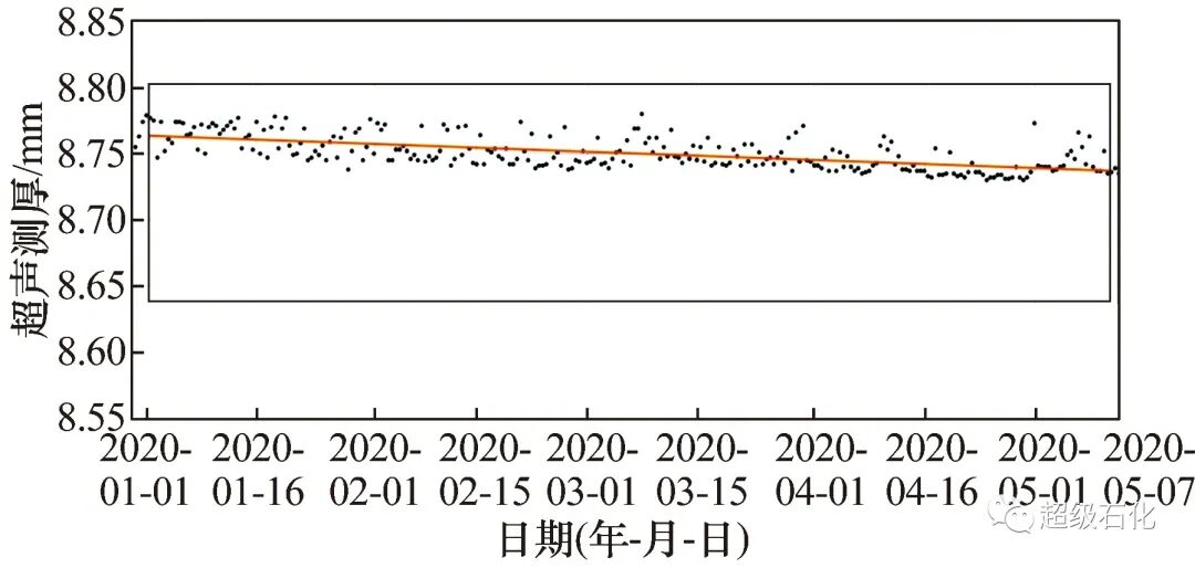 图6 常顶空冷器出口部位管线在线测厚2.2.4 在线探针监测蒸馏装置常顶、减顶系统在线探针腐蚀监测数据见表4由表4可知,蒸馏装置加工高氯原油期间常顶系统的腐蚀速率稍高于减顶系统的腐蚀速率,但两系统的腐蚀速率最大值仅为0.068 mm/a,远小于系统监测指标值0.20 mm/a,常顶、减顶系统腐蚀速率较低,系统腐蚀轻微。