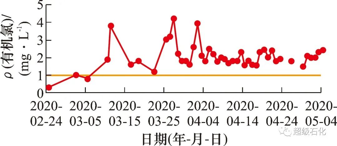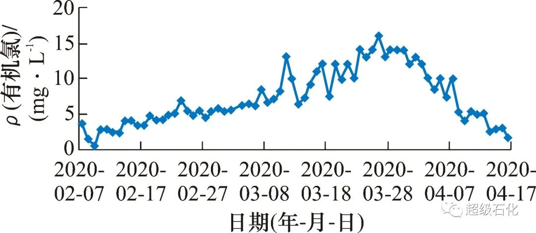 1 高氯原油腐蚀风险分析1.1 有机氯监测及腐蚀影响对进厂高氯原油有机氯含量变化情况进行连续监测,结果如图1所示由图1可知,自2月初高氯原油进厂以来,原油中的有机氯质量浓度呈明显上升趋势,至3月下旬达到顶峰值16 mg/L,随后开始下降,并稳定在5.0 mg/L以下,4月中旬至5月初高氯原油掺炼结束,有机氯质量浓度均在2.0 mg/L以下,与掺炼高氯原油之前的数值相当。