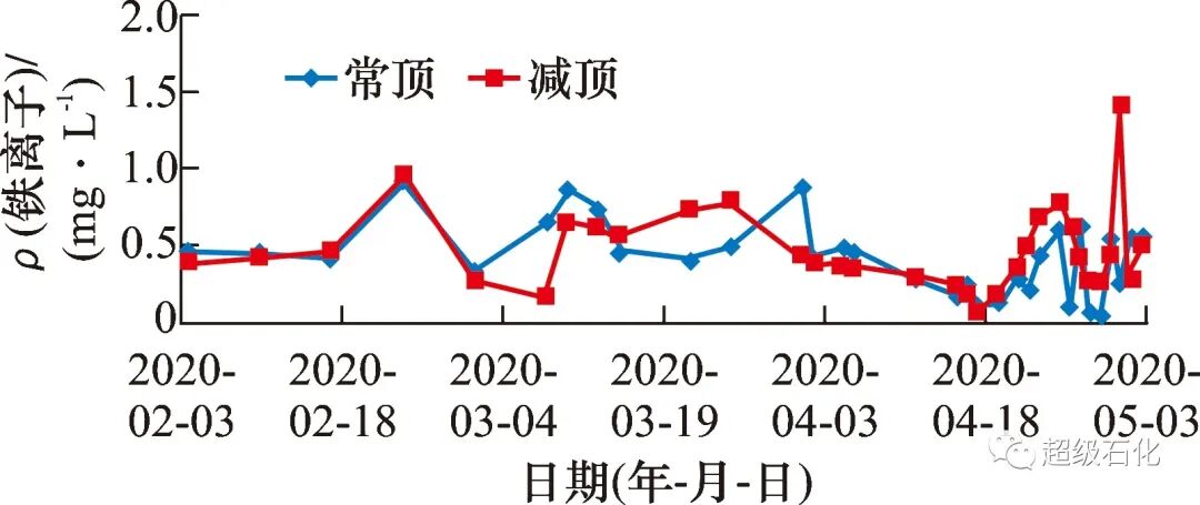 常顶、减顶冷凝冷却系统酸性水的腐蚀产物监测数据分别见图3和图4由图3、图4可知,常顶冷凝冷却系统酸性水pH值平稳控制在设防值5.5~7.5,且腐蚀产物铁离子质量浓度均小于1.0 mg/L,满足设防值要求,该系统整体腐蚀性较小,腐蚀轻微;减顶冷凝冷却系统酸性水pH值除偶有两组数据超设防值5.5~7.5外,整体控制平稳,且腐蚀产物铁离子质量浓度均小于1.5 mg/L,满足设防值要求,该系统整体腐蚀性亦较小,腐蚀轻微。
