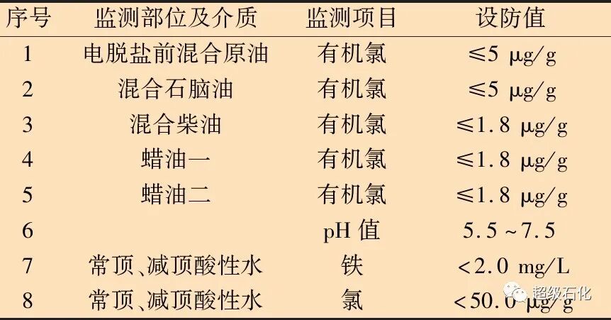 2.1.2 建立腐蚀监测方案及设防值为了实时掌握高氯原油加工对装置的腐蚀影响及防护措施实施效果,依据上述高氯原油性质、各馏分中有机氯分布、蒸馏装置有机氯腐蚀高风险设备及管道识别等关键分析数据,针对装置受有机氯腐蚀影响的高风险部位,建立了以酸性水监测、在线测厚、在线探针及腐蚀挂片为主的腐蚀监测方案(监测频次为每天一次),并规定了监测项目设防值(见表3)。