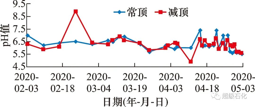 图3 常顶、减顶冷凝冷却系统酸性水pH值