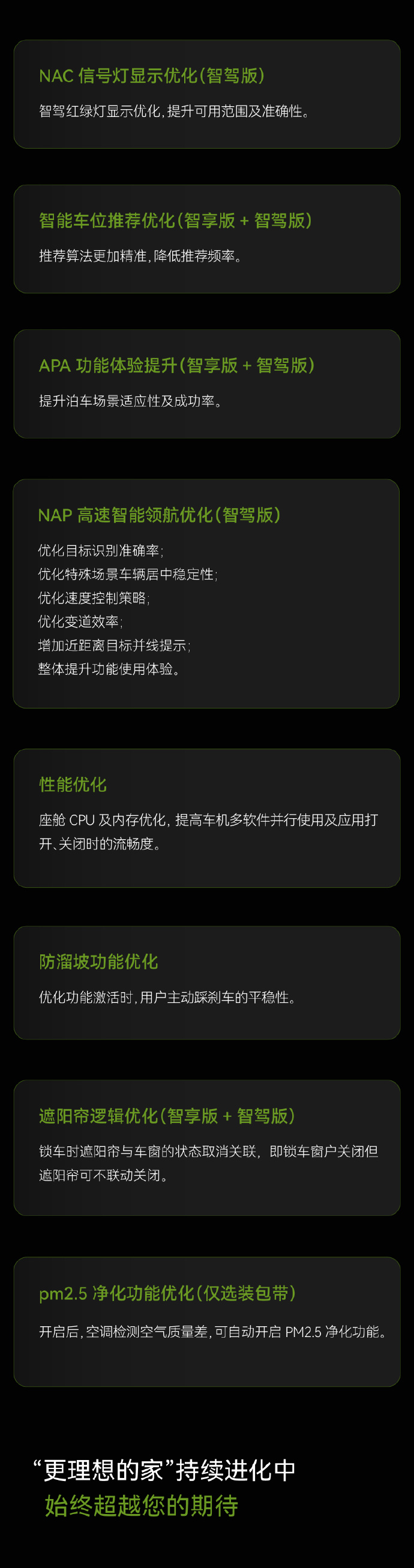 Widget 卡片增加健康充电及电池提醒零部件保养信息发动机定期启动(增程版)充值网络自动下电休眠功能氛围灯影院律动(仅选装包带)新增不同种类的动态和静态壁纸(动物、植物、城市)此外,该版本还带来了 16 项优化体验