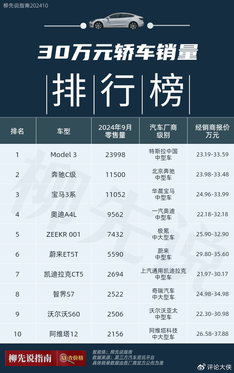 排在榜单第6的蔚来ET5T,2024年9月零售销量达5590辆,是一款纯电动旅行轿车30万元轿车销量排行榜1-5名:Model 3、奔驰C级、宝马3系、奥迪A4L以及ZEEKR 001特斯拉Model 3位居第一,月零售量达到23998辆,是一款中型纯电动轿车。