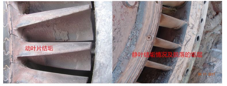四是在烟气轮机内有一定的温降过程,使催化剂结垢玻璃体逐渐变硬根据该装置运行以来,烟机振动波动,与装置工艺调整,跑剂现象等有密切关系;再就是轮盘及密封蒸汽品质问题,因装置水质原因,导致装置余锅、汽轮机结垢,轮盘或蒸汽密封处可能存在结盐,所以判断烟机转子不平衡主要原因转子积垢,或轮盘结盐。