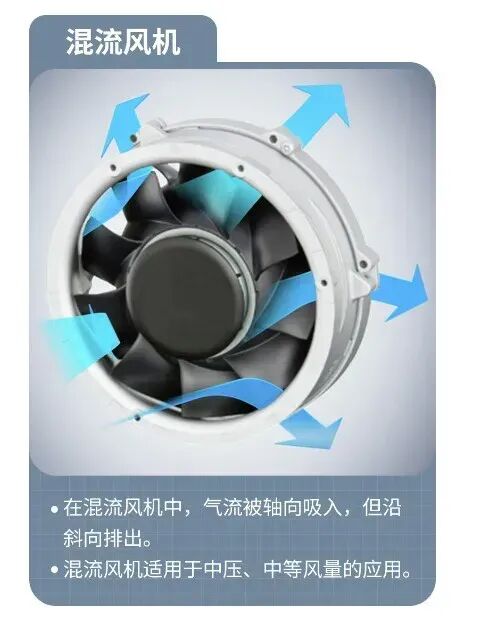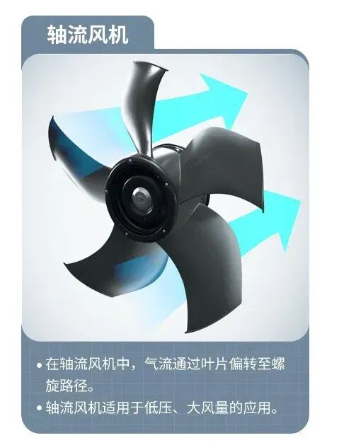 综上所述,选择风机时应考虑应用场景的具体需求,如需要大风量且对噪音和能效有较高要求时,轴流风机是较好的选择;若需要中等风量和中等风压,且对噪音要求适中时,混流风机可能更适合;若需要高风压且能容忍一定噪音时,则离心风机是更好的选择。
