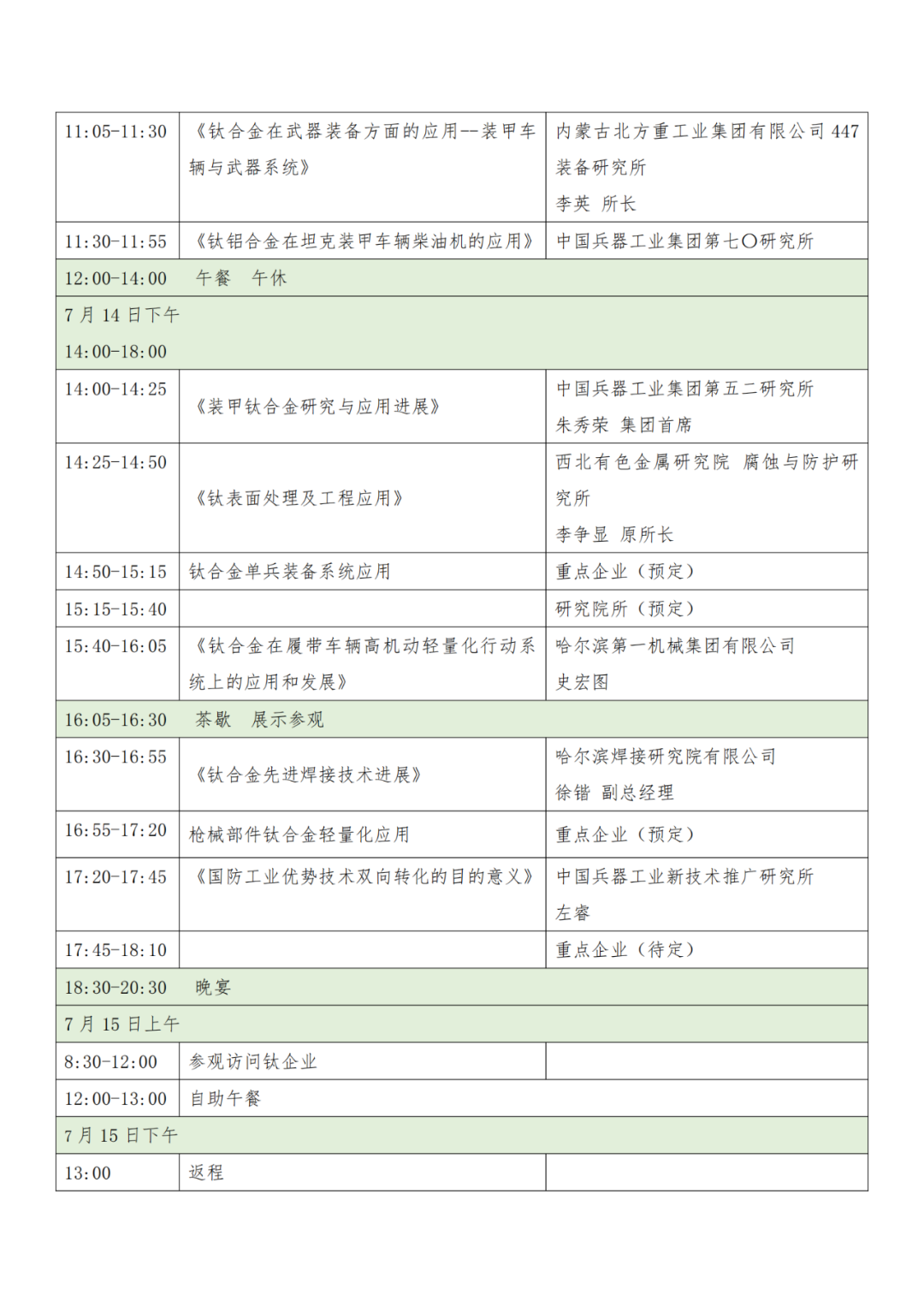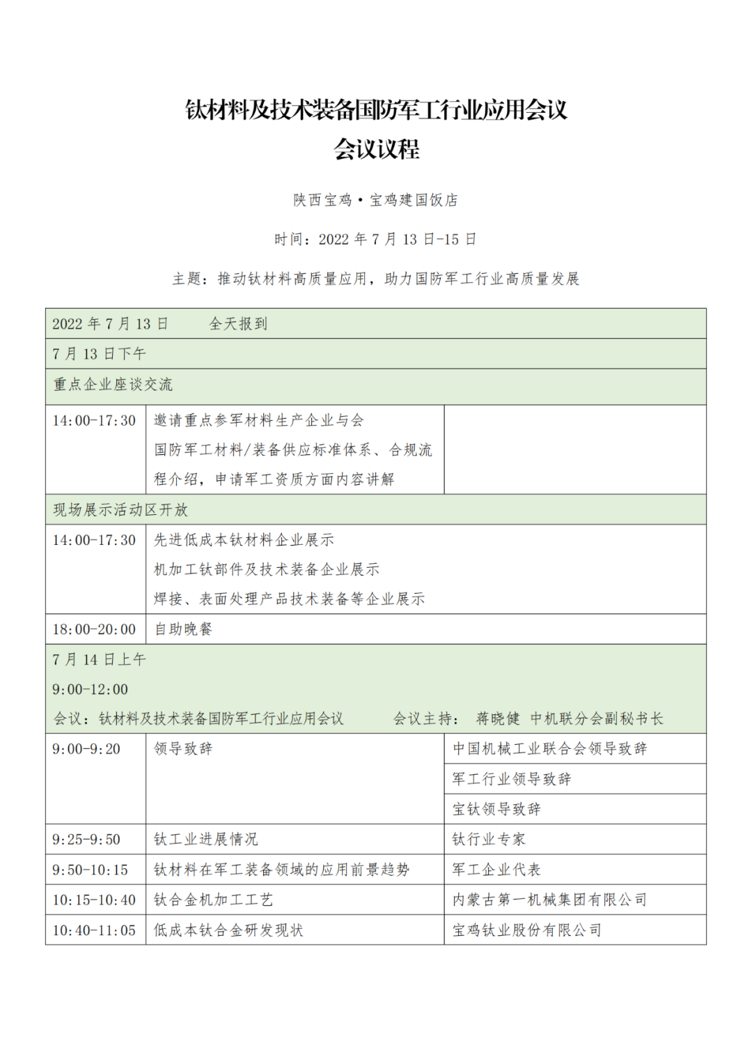 会议安排:1、7月13日 全天报到;下午:国防军工材料、装备供应标准体系、合规流程介绍专题会议;2、7月14日 全天会议;3、7月15日 参访企业、返程(上午:参观访问当地钛企、午餐、下午:返程)