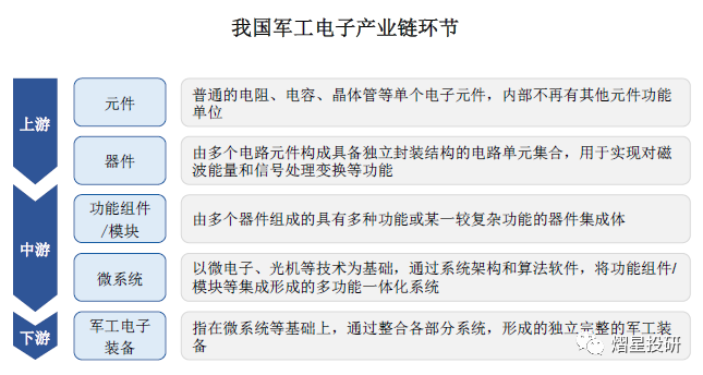 军工电子产业链自上而下包括元件、器件、功能组件/模块、微系统以及装备整机上游元件和器件是整个军工电子产业的基础,具有较好的兼容性,可针对不同的应用场景满足客户的定制需求;中游功能组件/模块和微系统是整机的重要子系统,实现具体功能;。