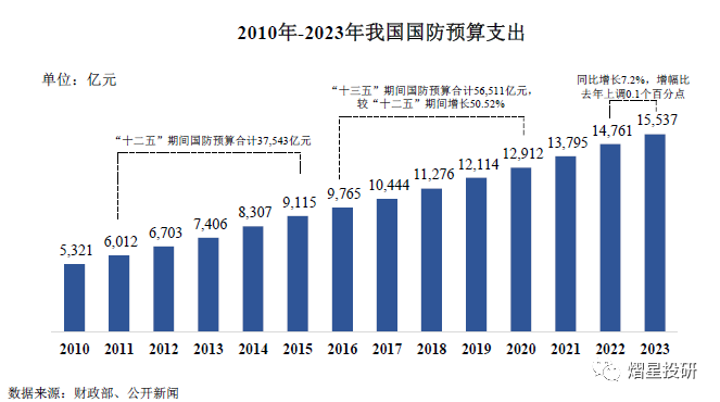 军工电子行业的发展与军工行业整体发展情况密切相关,而军工行业的前景则取决于我国的总体国防战略当今世界正经历百年未有之大变局,国际政治形势及国家安全环境发生深刻变化,强军建设已经成为重要的国家发展战略根据财政部的统计数据,“十三五”期间军费预算较“十二五”期间增幅近50%;根据公开新闻报道,2023年我国国防预算约为15,537亿元,同比增长7.2%,增幅比去年上调0.1个百分点。