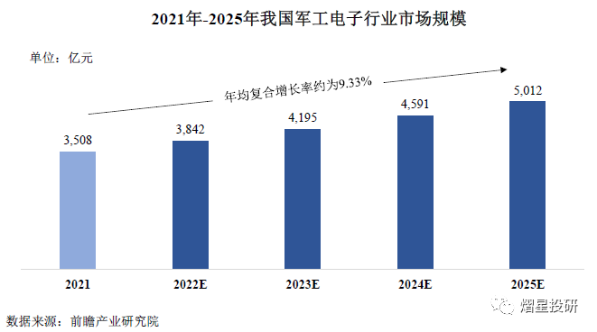受益于我国国防预算的增长、装备支出持续走高和国防信息化建设进程的有序推进,我国军工电子行业进入持续增长周期根据前瞻产业研究院的测算,2025 年,我国军工电子行业市场规模预计将达到5,012 亿元,2021-2025年复合增长率将达到9.33%。