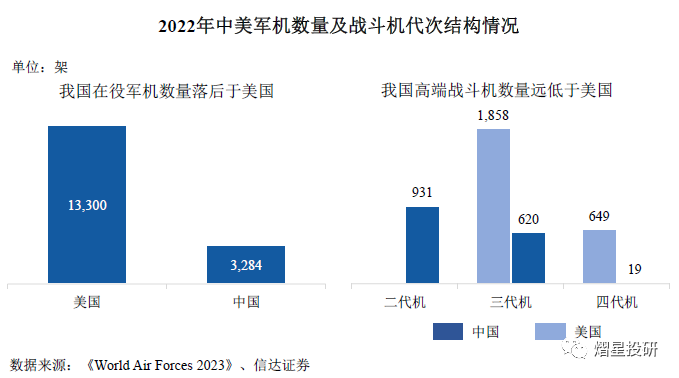 另一方面,我国军机代次结构处于相对落后状态按当前较多采用的西方四代分类标准,2022年我国在役战斗机中第二代战斗机数量931架,第三代战斗机数量620架,第四代战斗机数量19架,新一代战斗机比重显著落后于美国。